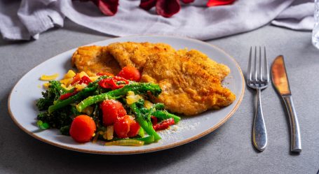 Wilder Broccoli (Bimi) mit confierten Tomaten und Schnitzel "Wiener Art"