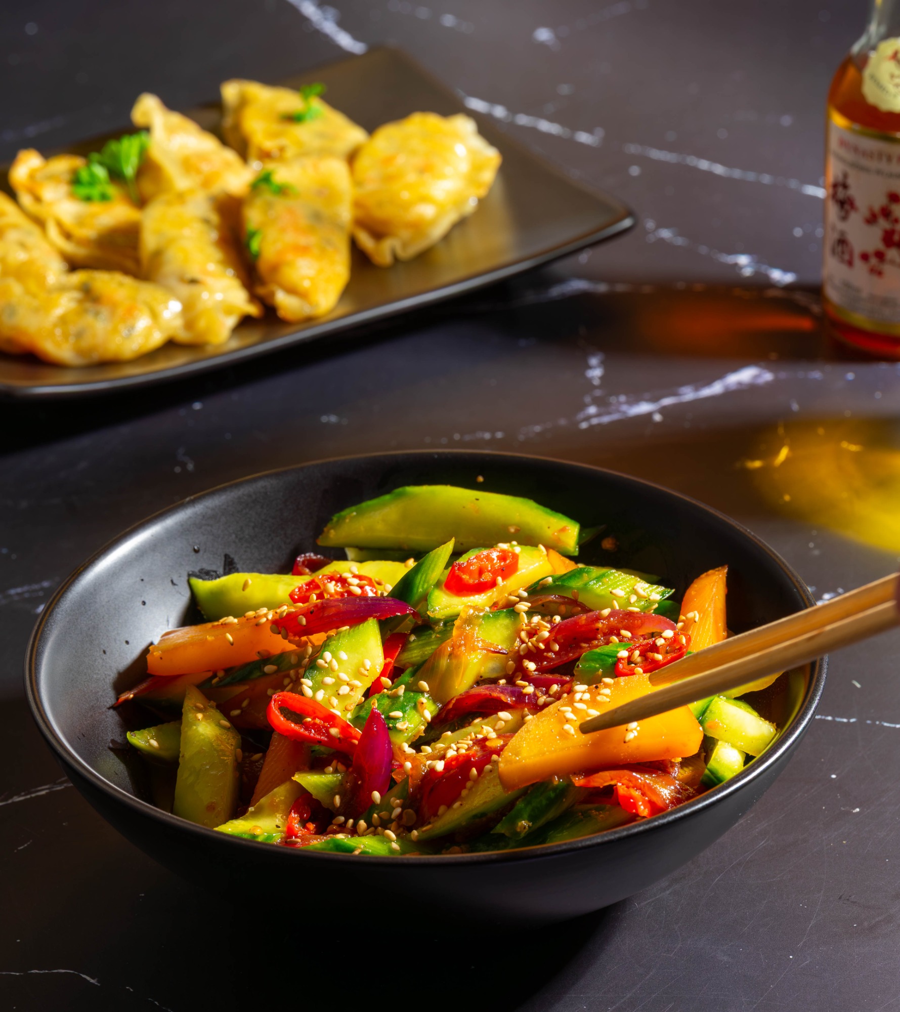 Pellkartoffel, Kräuterquark, Gurkensalat, Hähnchenunterkeule