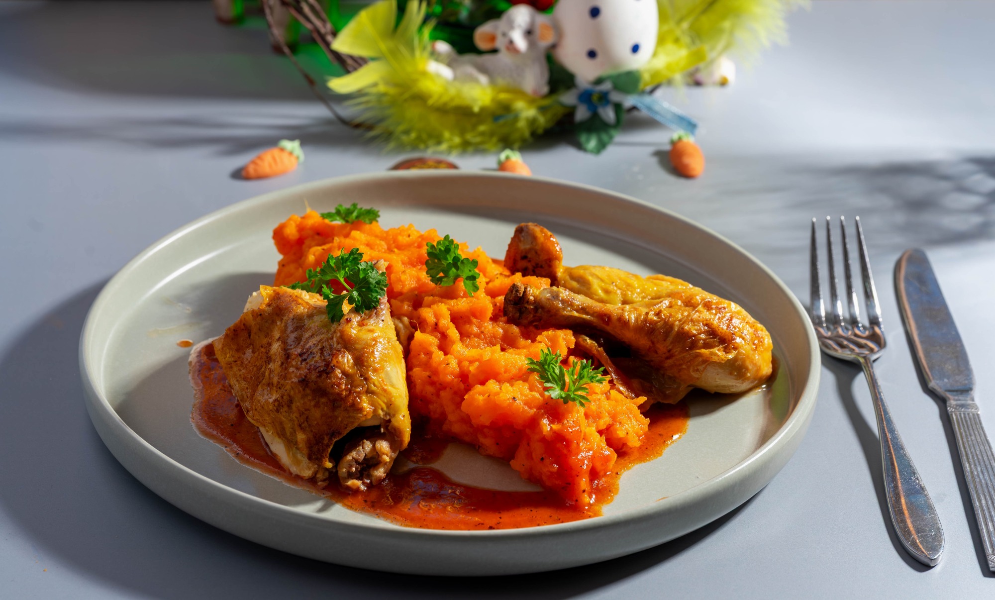 Stubenküken mit Süßkartoffelpüree