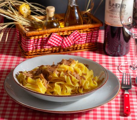 Maultaschen auf Spinat mit Schmorzwiebeln und Maultaschen in Rinderbrühe