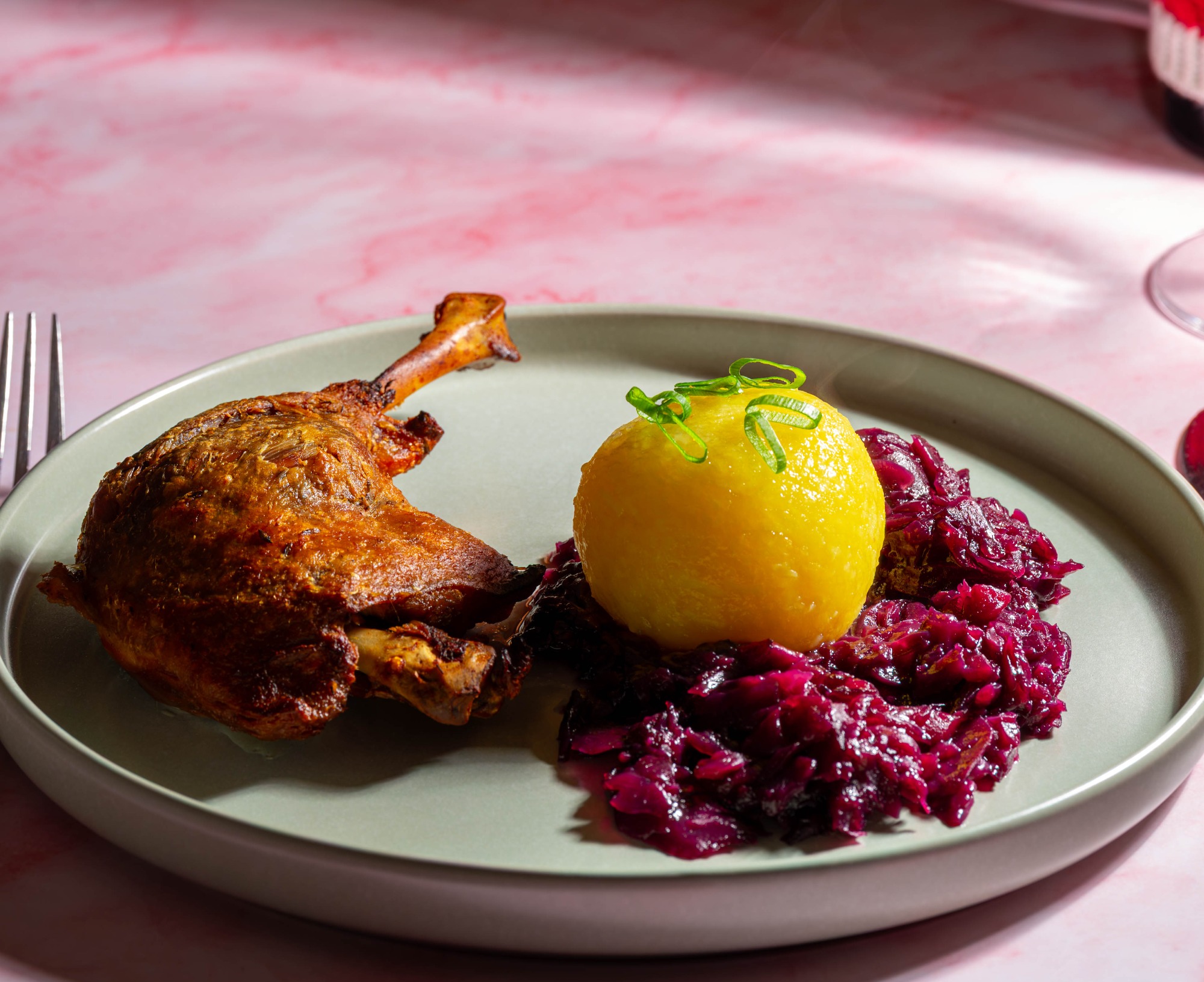 Confierte Entenkeule mit Rotkohl und Kartoffelklöße